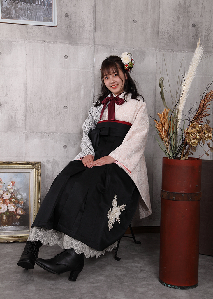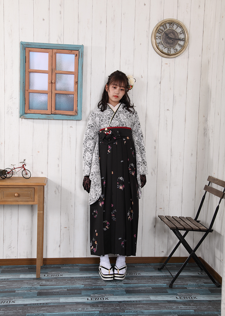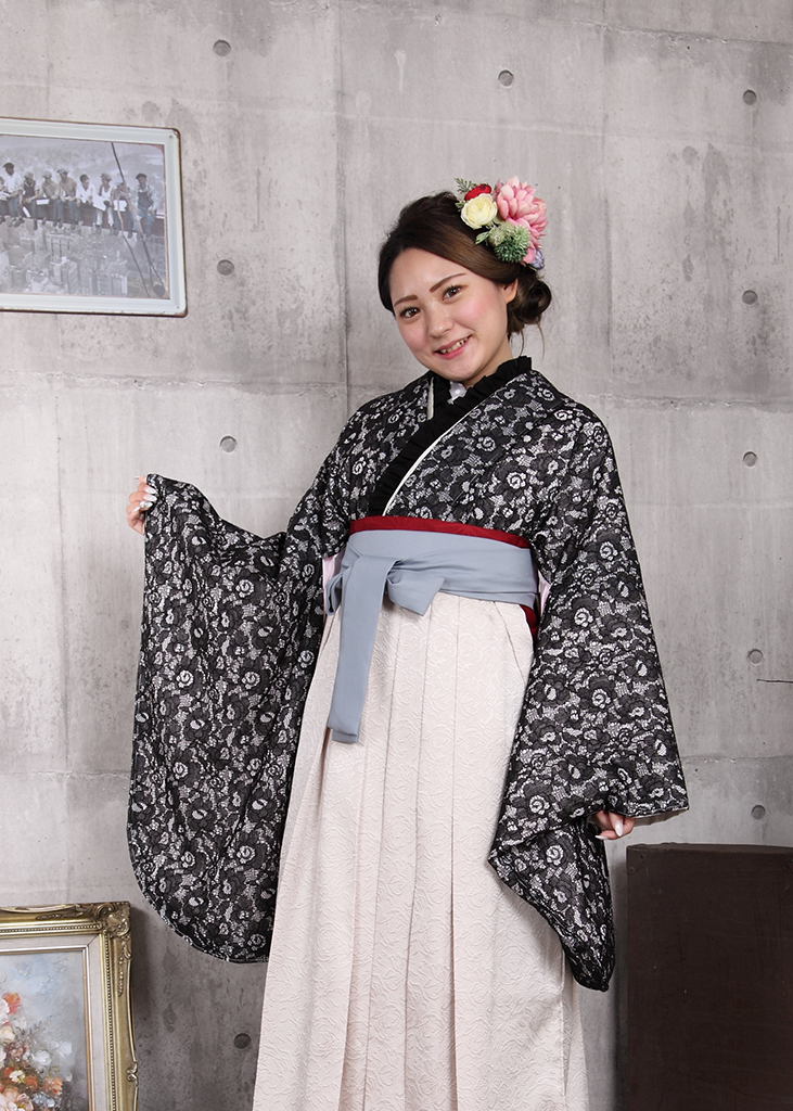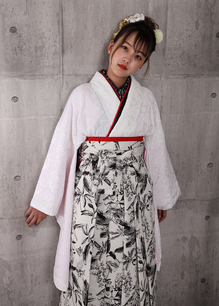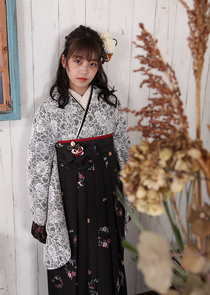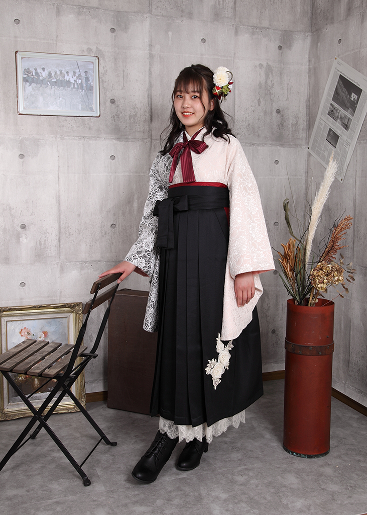 白地の生地の上に黒の花柄レースでボリュームを持たせた可愛げのある着物。襟元にはフリルをあしらい、可憐な乙女を演出します。袴には白のジャガード調生地で重厚感のある袴スタイルに。ウエストにはピンクグレーのリボンでキツクならないように、色の魔術で遊び心をプラス。