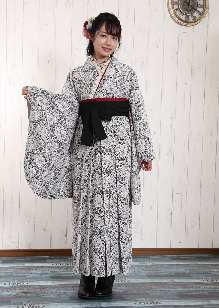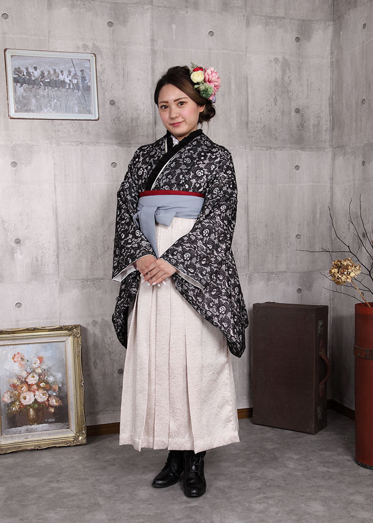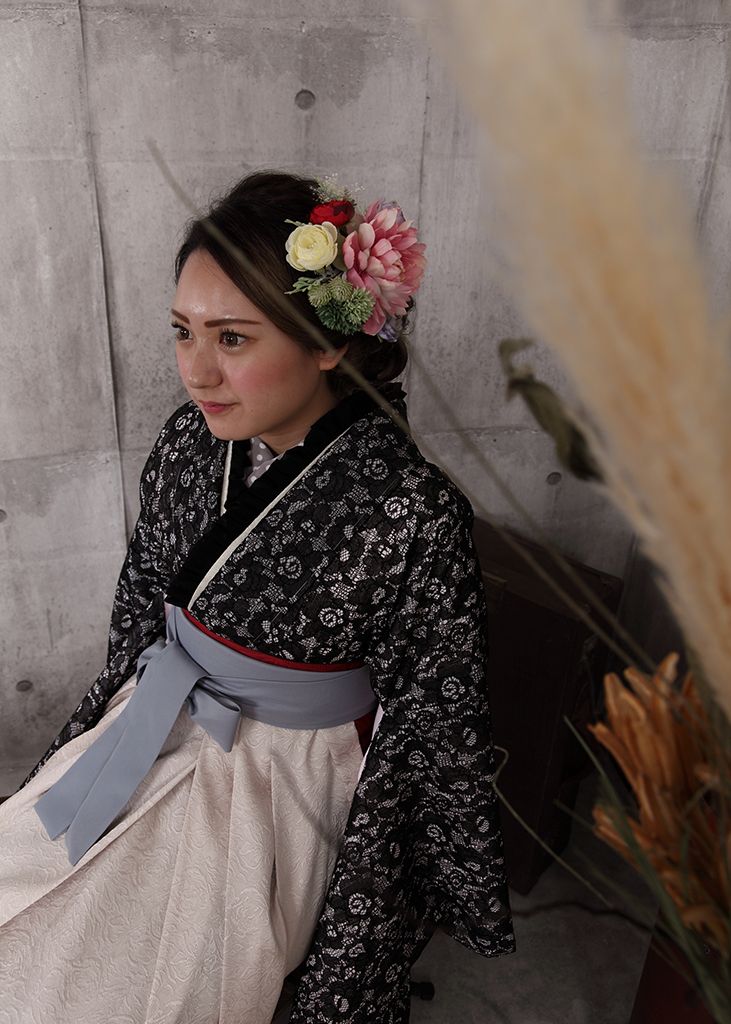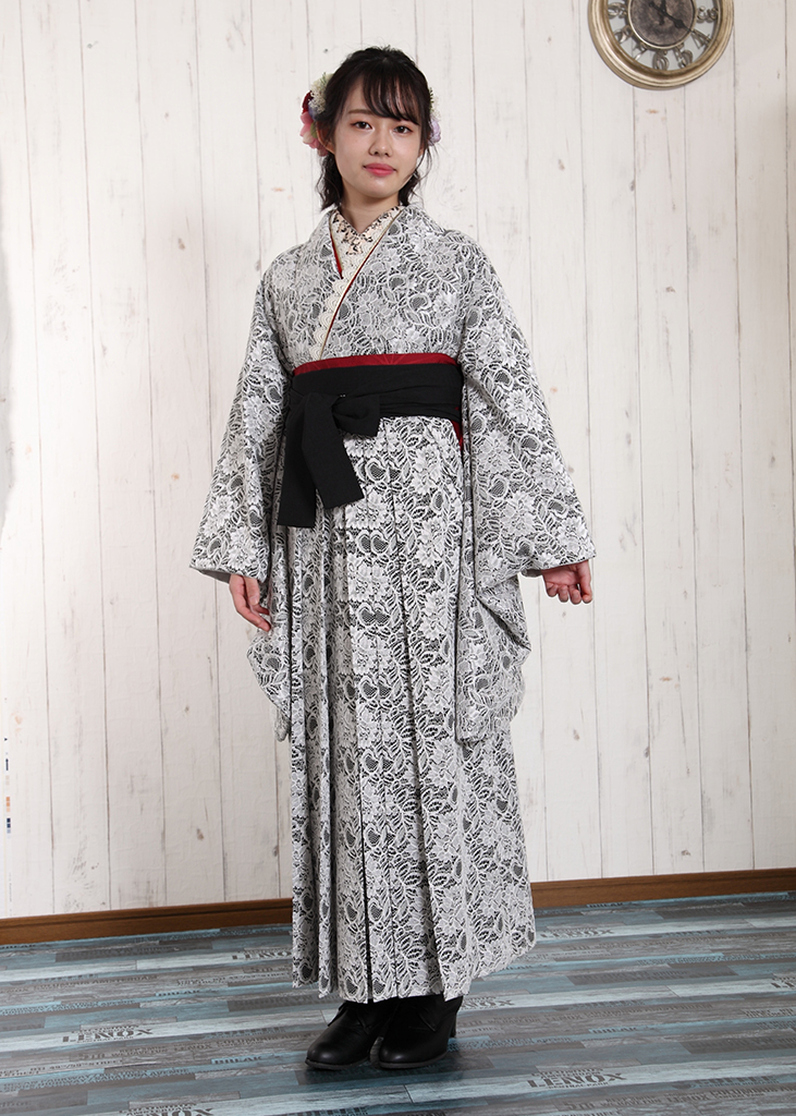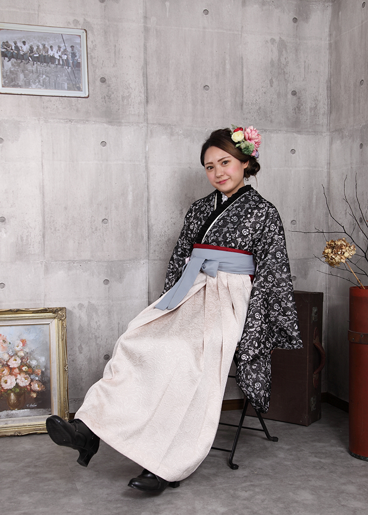 白地の生地の上に黒の花柄レースでボリュームを持たせた可愛げのある着物。襟元にはフリルをあしらい、可憐な乙女を演出します。袴には白のジャガード調生地で重厚感のある袴スタイルに。ウエストにはピンクグレーのリボンでキツクならないように、色の魔術で遊び心をプラス。