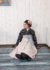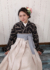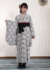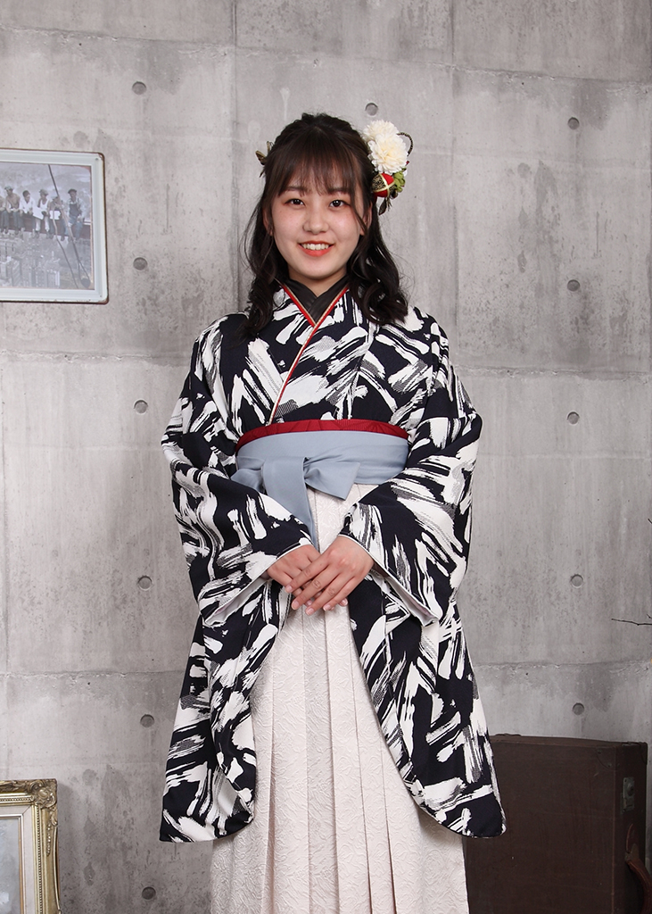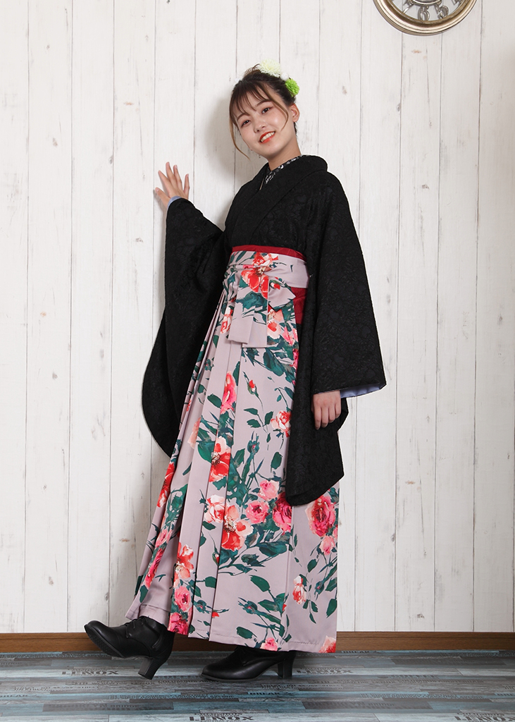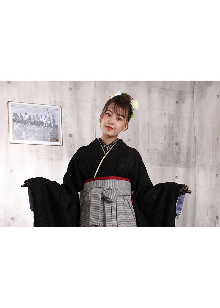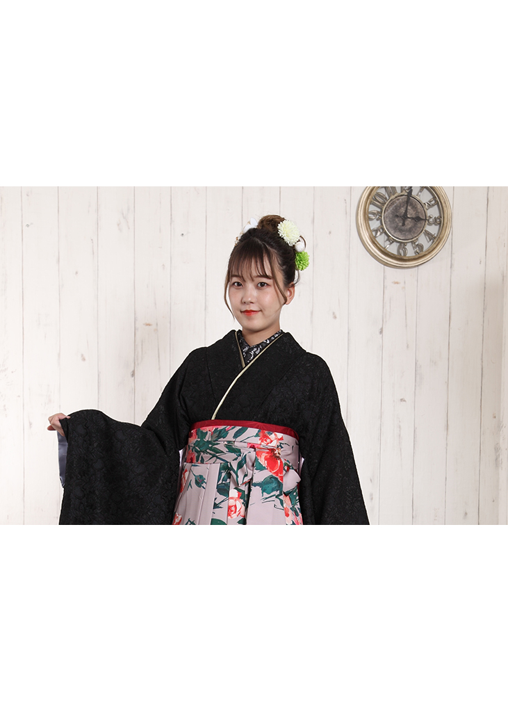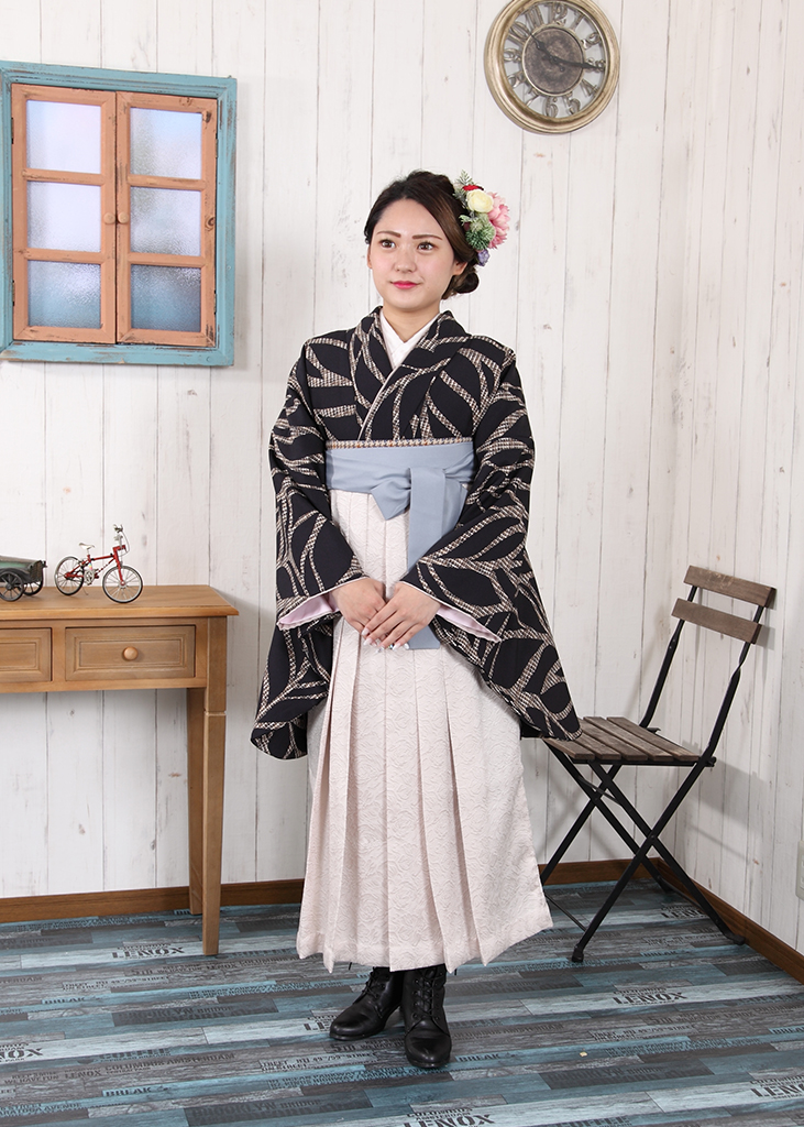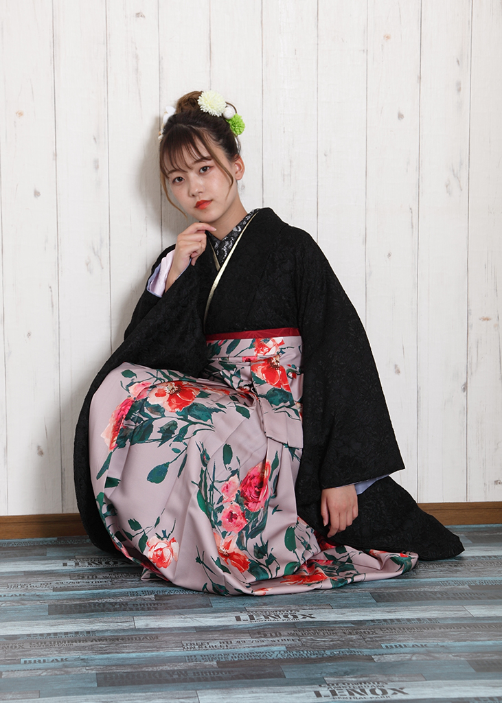 白地の生地の上に黒の花柄レースでボリュームを持たせた可愛げのある着物。襟元にはフリルをあしらい、可憐な乙女を演出します。袴には白のジャガード調生地で重厚感のある袴スタイルに。ウエストにはピンクグレーのリボンでキツクならないように、色の魔術で遊び心をプラス。