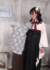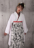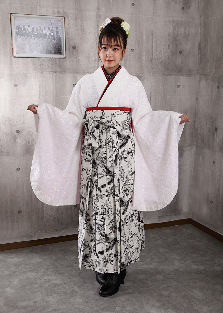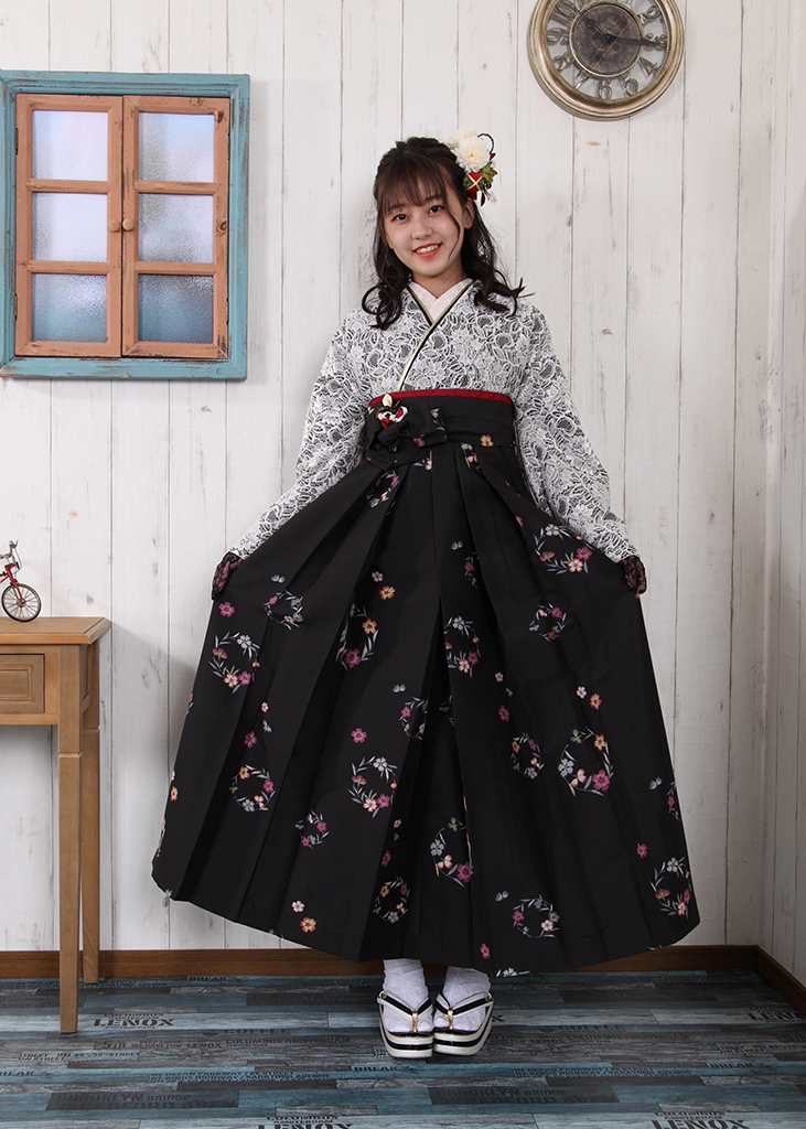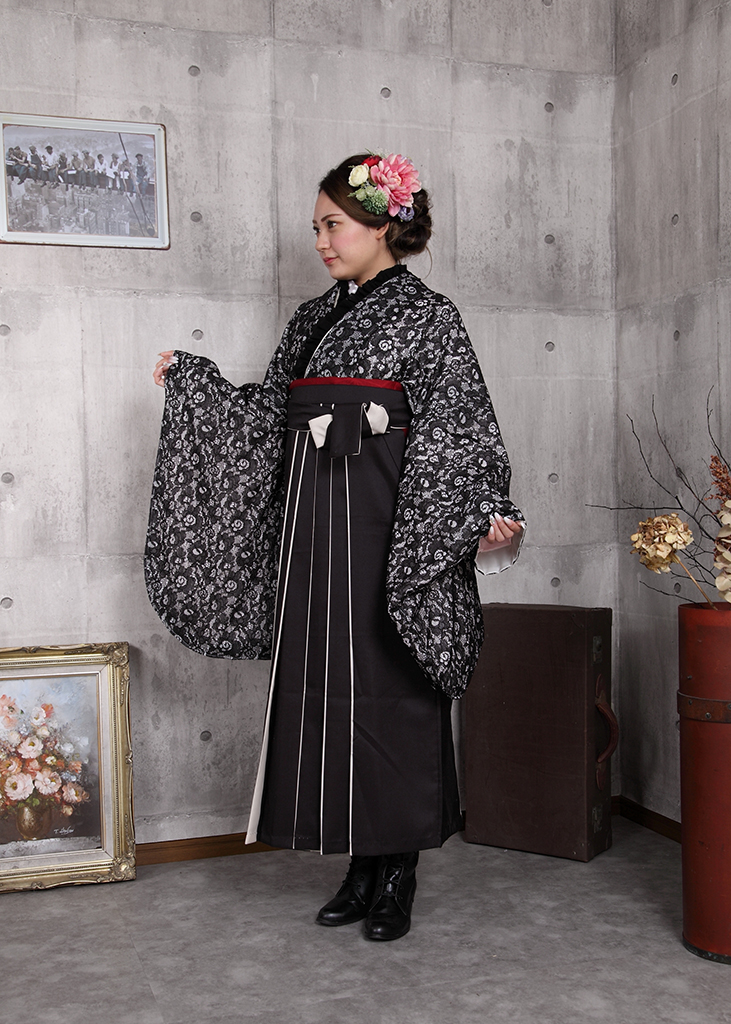 ゴシップ&ロリータファッション風のスタイル。白地の生地の上に黒の花柄レースでボリュームを持たせた可愛らしい着物。襟元にはフリルをあしらい、可憐な乙女を演出します。袴には独創的な黒地に白のバイピングと裏から覗く白地がとても新しい。綺麗系ゴスロリ調の袴スタイルです。