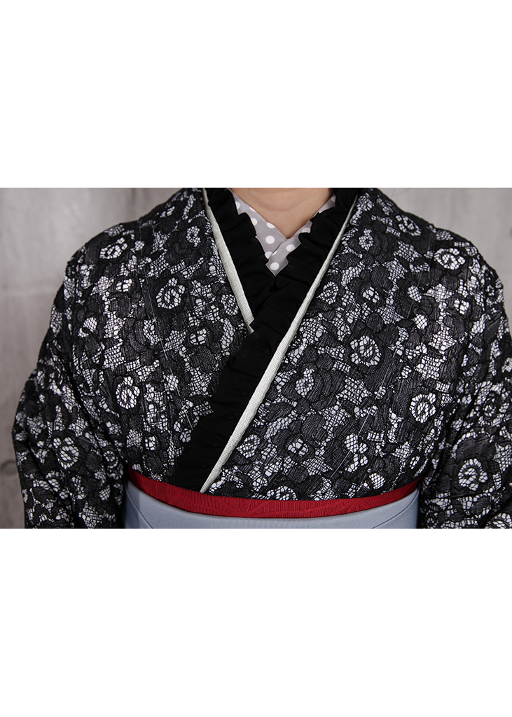 黒の地色に白花のレースを纏った(まと)ラグジュアリーな二尺袖。