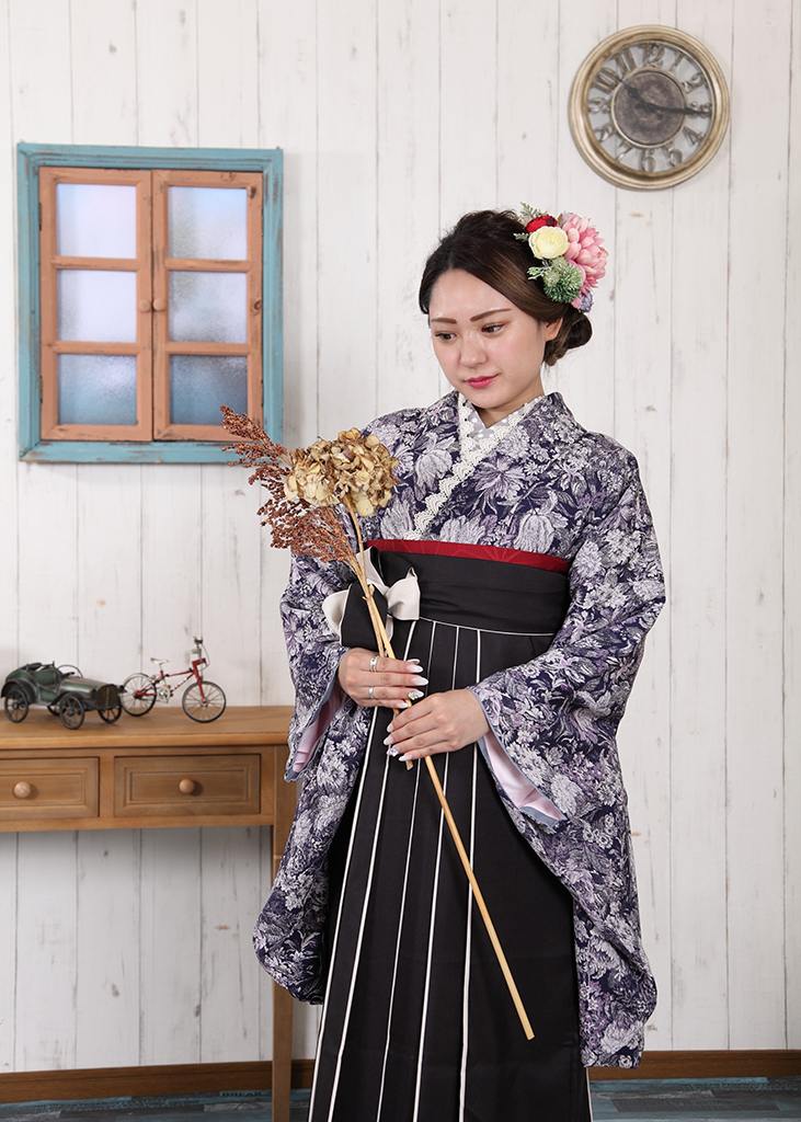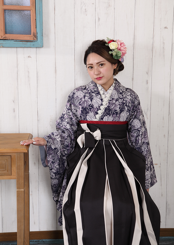 濃い紫地色に濃淡で描かれたヨーロピアン調の花たちが大人な雰囲気を身に纏わせてくれる(まとう)着物。襟元には甘くなりすぎないレースで一層 顔廻りを引き立たせています。袴はあえてシンプルに、でも単調になりすぎないように、白と黒で全体をイイ甘さにする卒業スタイルに仕上げています。