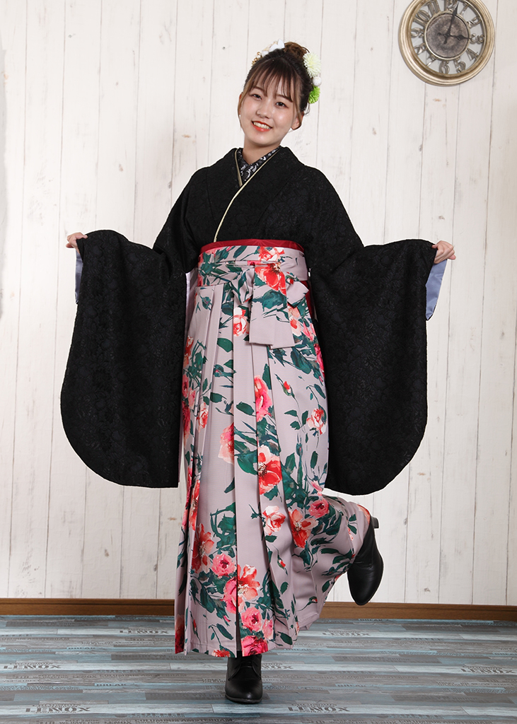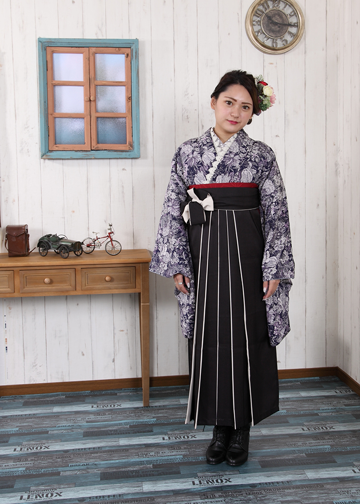 濃い地色に白の花柄レースを重ね合わせボリュームを持たせたエレガントな装いの着物。襟元はスッキリ見せる為、あえて光る生地を合わせてみました。袴には彩とりどりの花を散りばめた華紋で吉祥文様を描いています。個性を表現するならこのセットがお薦めな卒業スタイルです。