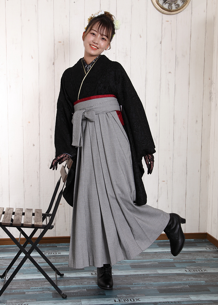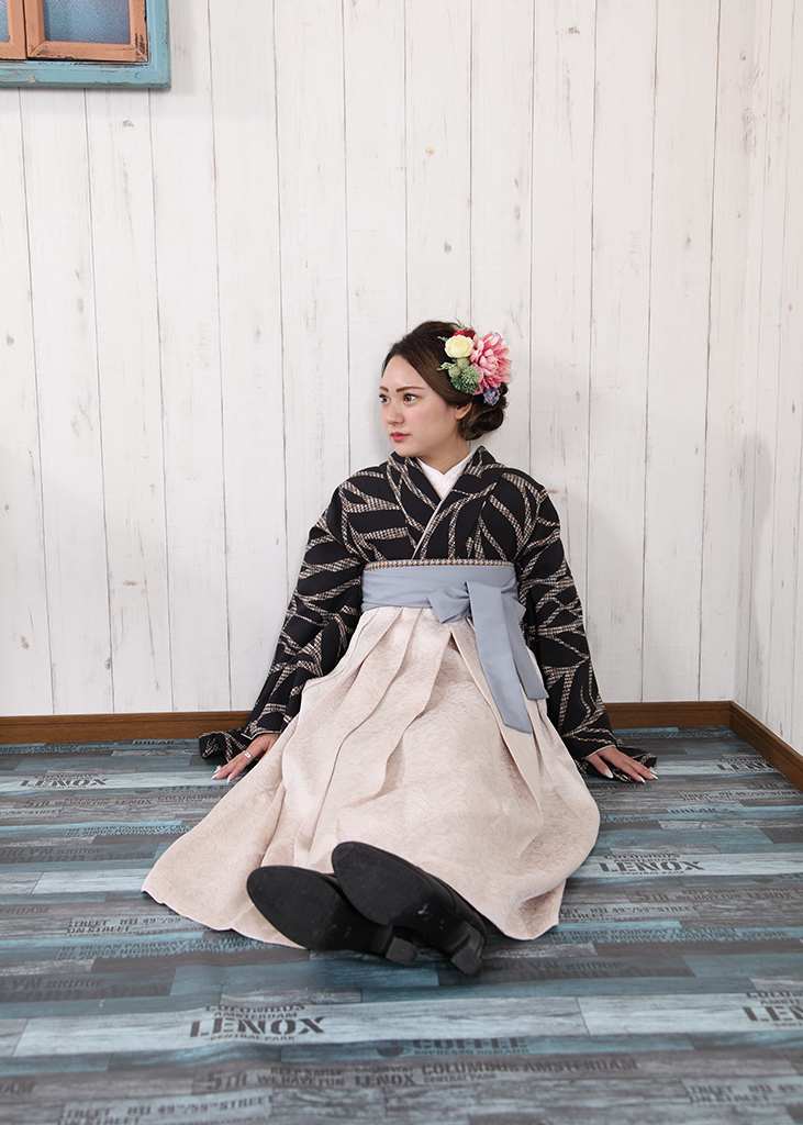 幾何学模様の黒と白のコントラストの着物にジャガード織で織り込まれた花柄の袴を合わせることで大人綺麗な女子に似合うスタイル。着る人の個性によって何重にも着こなせる、そんな綺麗系女子になれる袴姿です。