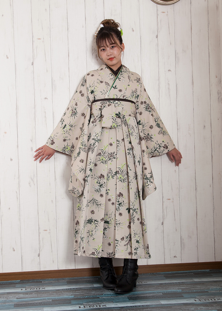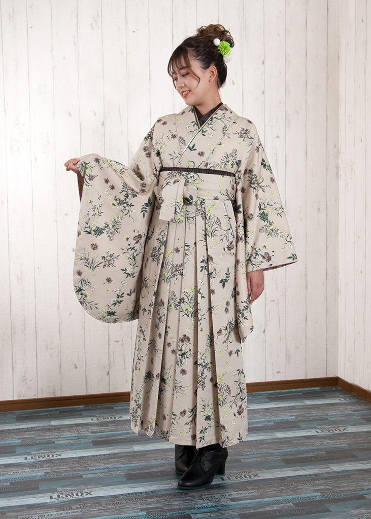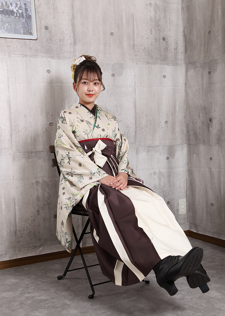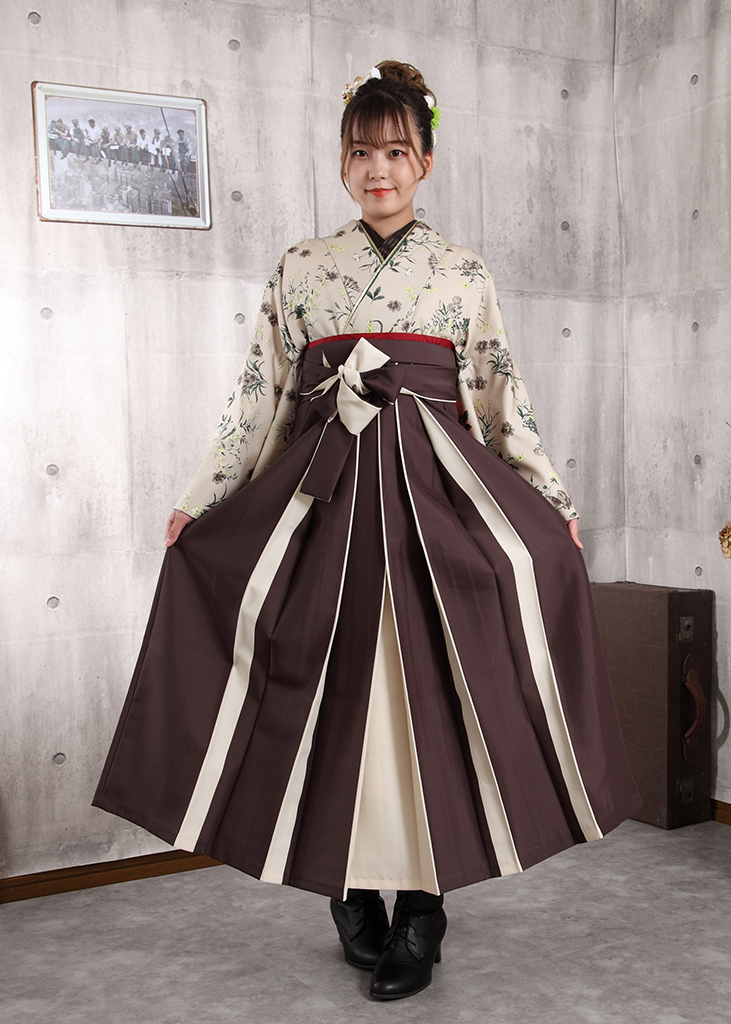 袴はシックに茶色と白でリバーシブルに作られた綺麗目スタイル。